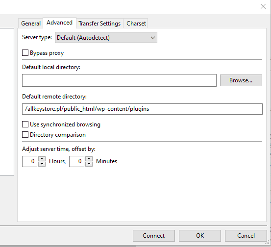 We are interested in the path in the “Default remote directory” field. Here you must enter the path to the plugins and templates directory. It must be a path directly leading to these directories from where we log in (where we are after logging in). If we use our main FTP account, after logging in we are in the main folder. There are website directories in it, most often with the same name as the website’s domain. Therefore, for example, in the case of our store, enter the path “/wpgplhub.com/public_html/wp-content/plugins”. Plugins are in the directory “/ Wp-content / plugins” a templates “/ Wp-content / themes” in our WordPress installation. Please note that the “public_html” directory is not always present, it depends on the hosting. If it is not present, we omit it from the path. Make sure there is no double “//”. Additionally, this address in FileZilla must always start with “/”